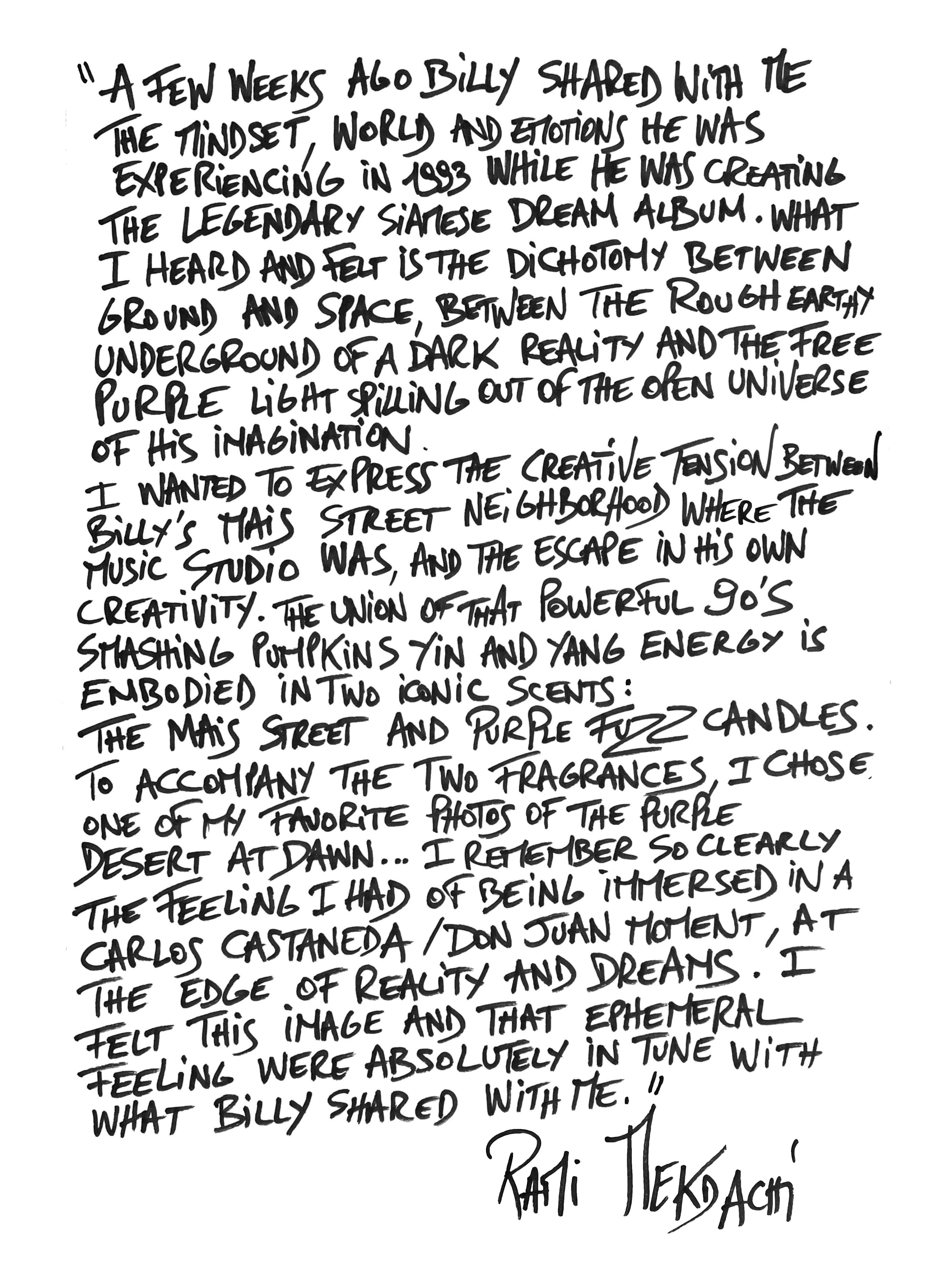 « A few weeks ago, Billy shared with me the mindset, world and emotions he wavis experiencing in 1993 while he was creating the legendary Siamese Dream album. What I heard and felt is the dichotomy between ground and space, between the rough earthy underground of a dark reality, and the free purple light spilling out of the open universe of his imagination. I wanted to express the creative tension between Billy’s Mais Street neighborhood where the music studio was, and the escape into his own creativity. The union of that powerful 90’s Smashing Pumpkins Yin and Yang energy is embodied in two iconic scents...The MAIS STREET and PURPLE FUZZ candles. »
