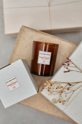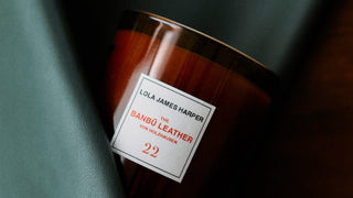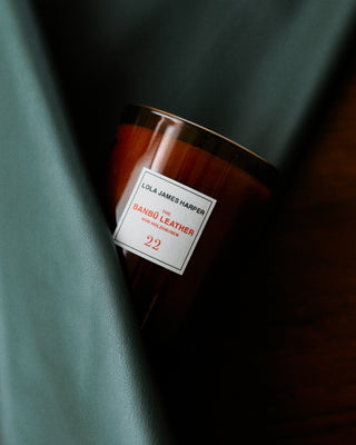 dream come true. And there is one thing that leather also has, it’s the only fabric that has a smell hence it’s the only fabric that encapsulates souvenirs... your first leather jacket, first suede shoes, the interior of your first car... Our mission at Lola James Harper was then to begin to dream up a scent for the vegan leather so it will encapsulate the full experience of the original leather fabrics. The Banbū Leather candle is the first step in that creative process... Bamboo, Spice and Incense"